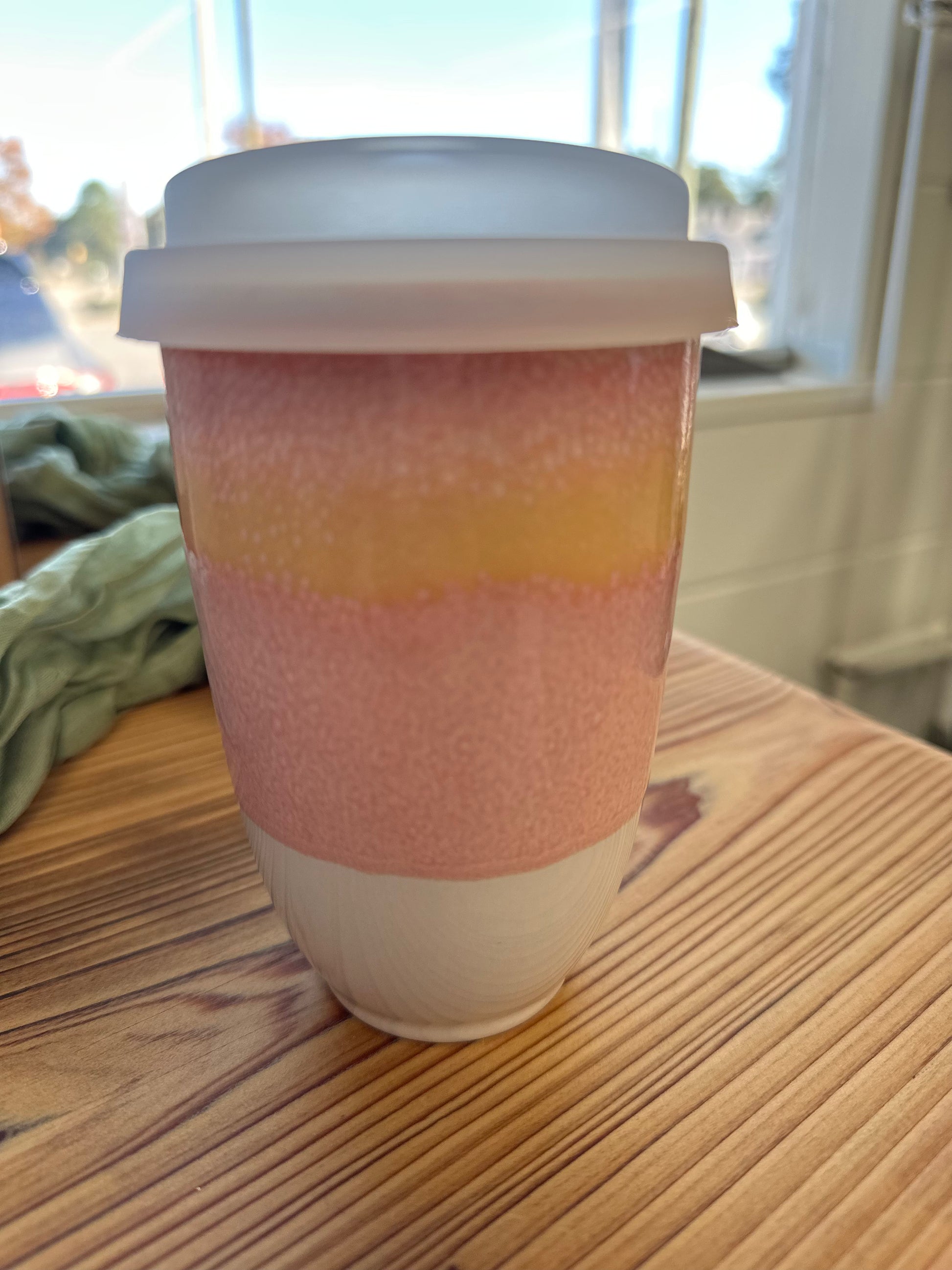 Each piece features a one-of-a-kind glazing process, making every cup a work of art. Made with durable materials, you can enjoy your coffee in style and reduce single-use waste. Perfect for coffee lovers and the environment. This cup is 12 oz is microwave and dishwasher safe.Elevate your mornings with our exquisitely crafted, reusable Afterglow coffee cups.