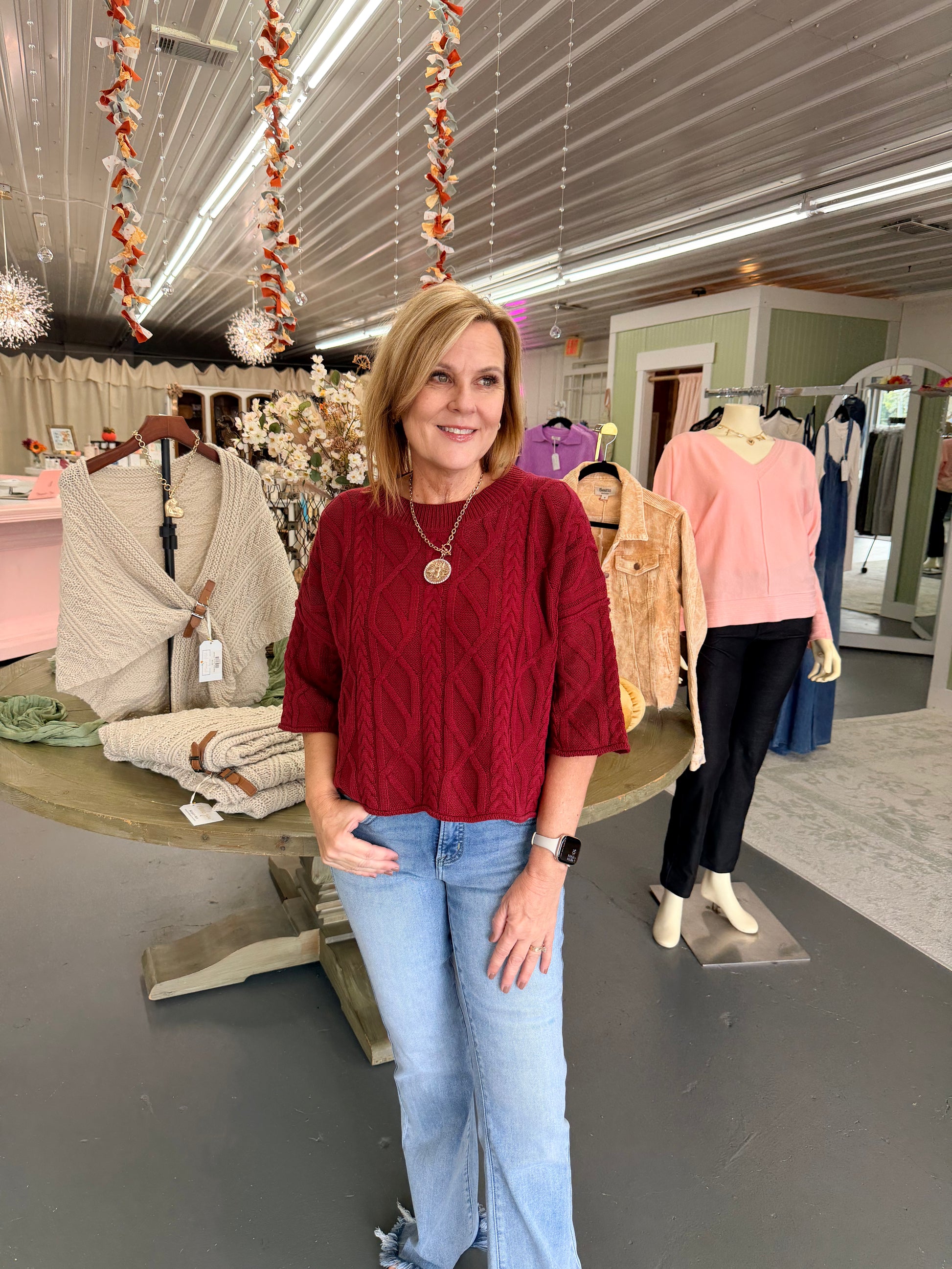 The Belinda Top features a sophisticated 3/4 sleeve silhouette crafted with a classic cable knit design, offering both texture and timeless style. Its breathable knit fabric ensures comfort and ease of movement, making it ideal for layering or standalone wear. Perfectly balancing elegance and coziness, this sweater elevates everyday wardrobes with refined craftsmanship.