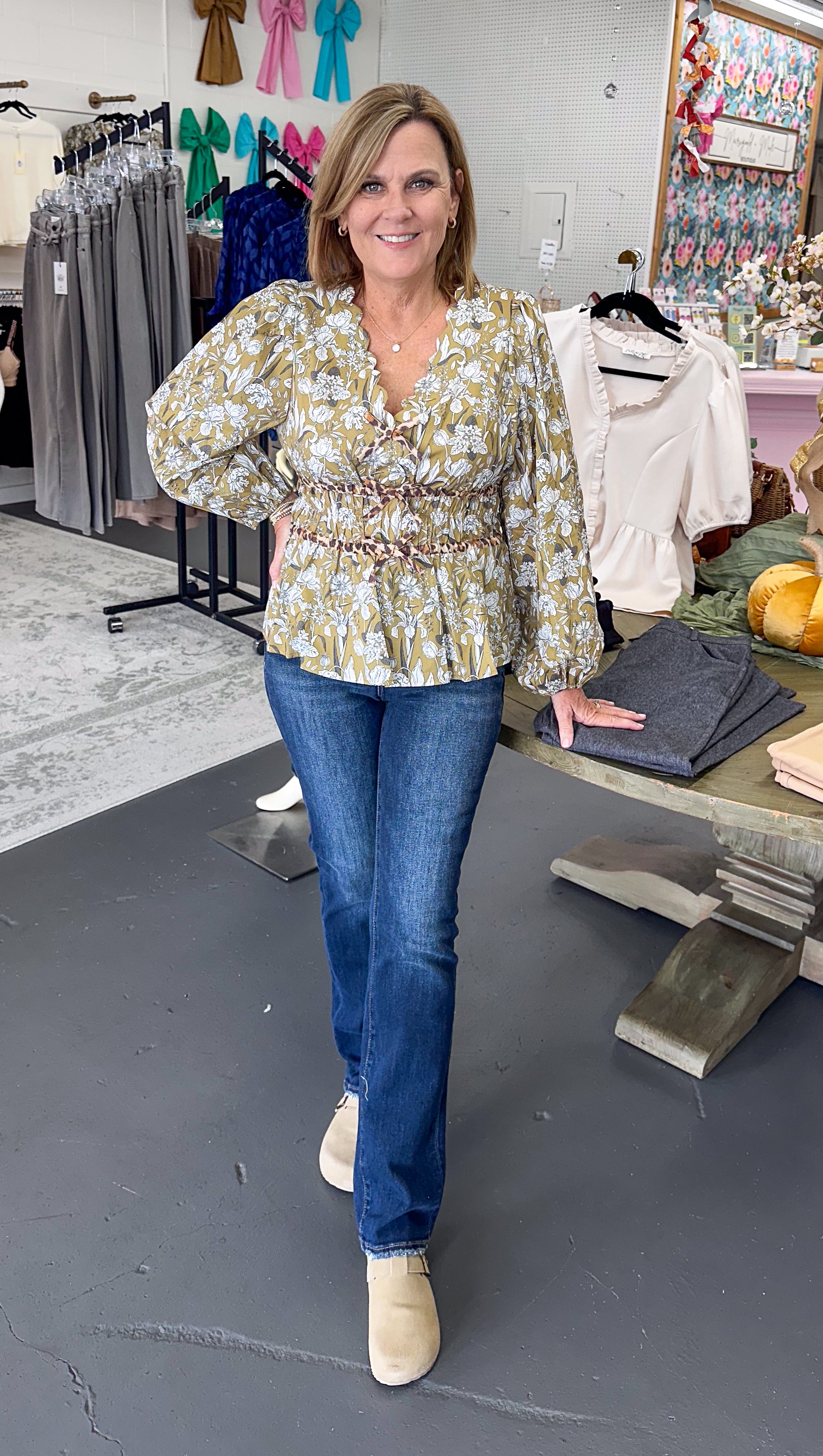 Elevate your wardrobe with the Cedric Top, featuring delicate floral line art print that adds a refined artistic touch. Its bishop sleeves offer graceful volume while maintaining a tailored silhouette. A scalloped V-neckline enhances elegance, complemented by a subtle ribbon strap for a secure yet feminine fit. This top combines sophisticated design with comfortable wear, perfect for transitional seasons or layering under structured jackets.