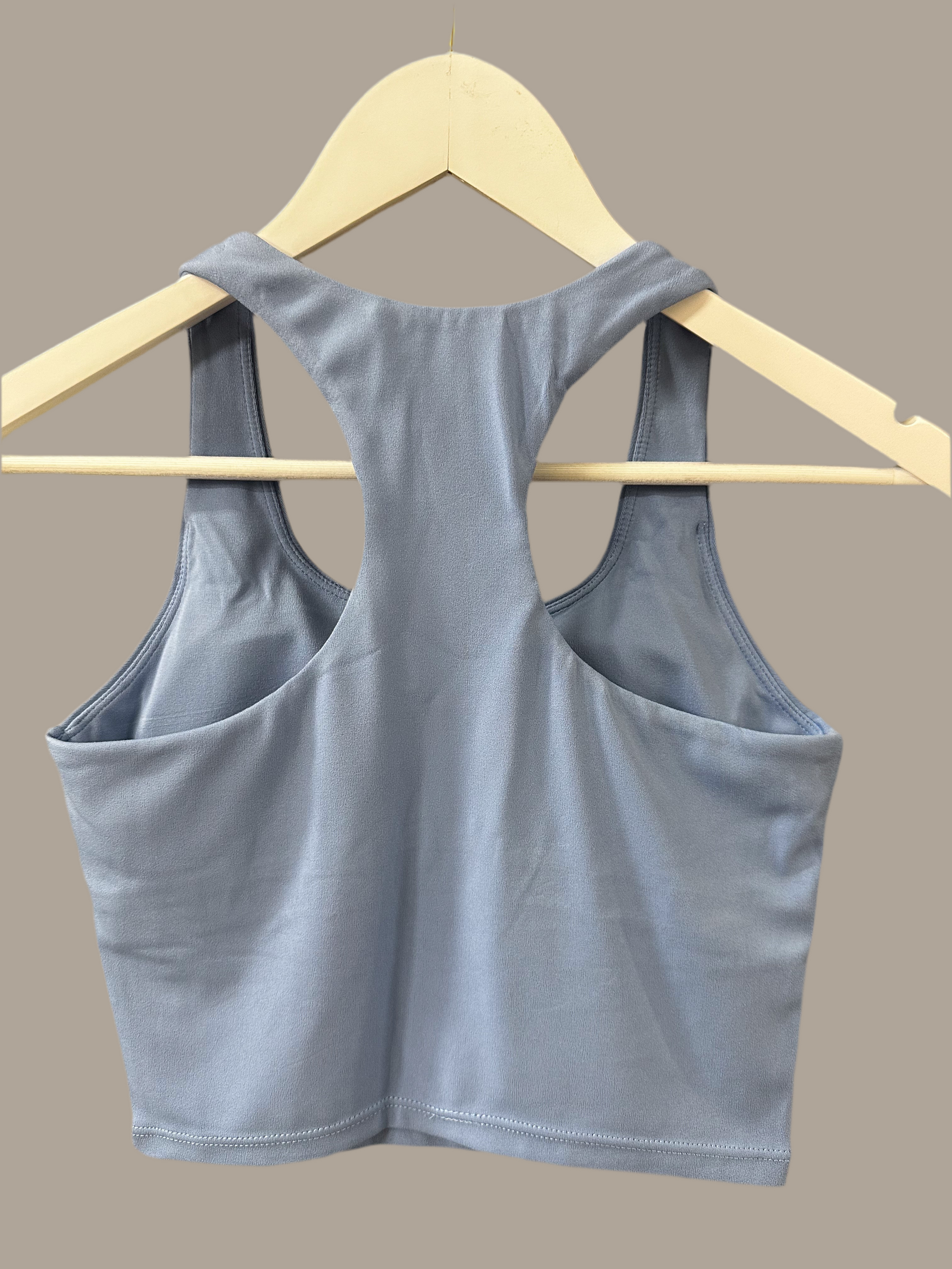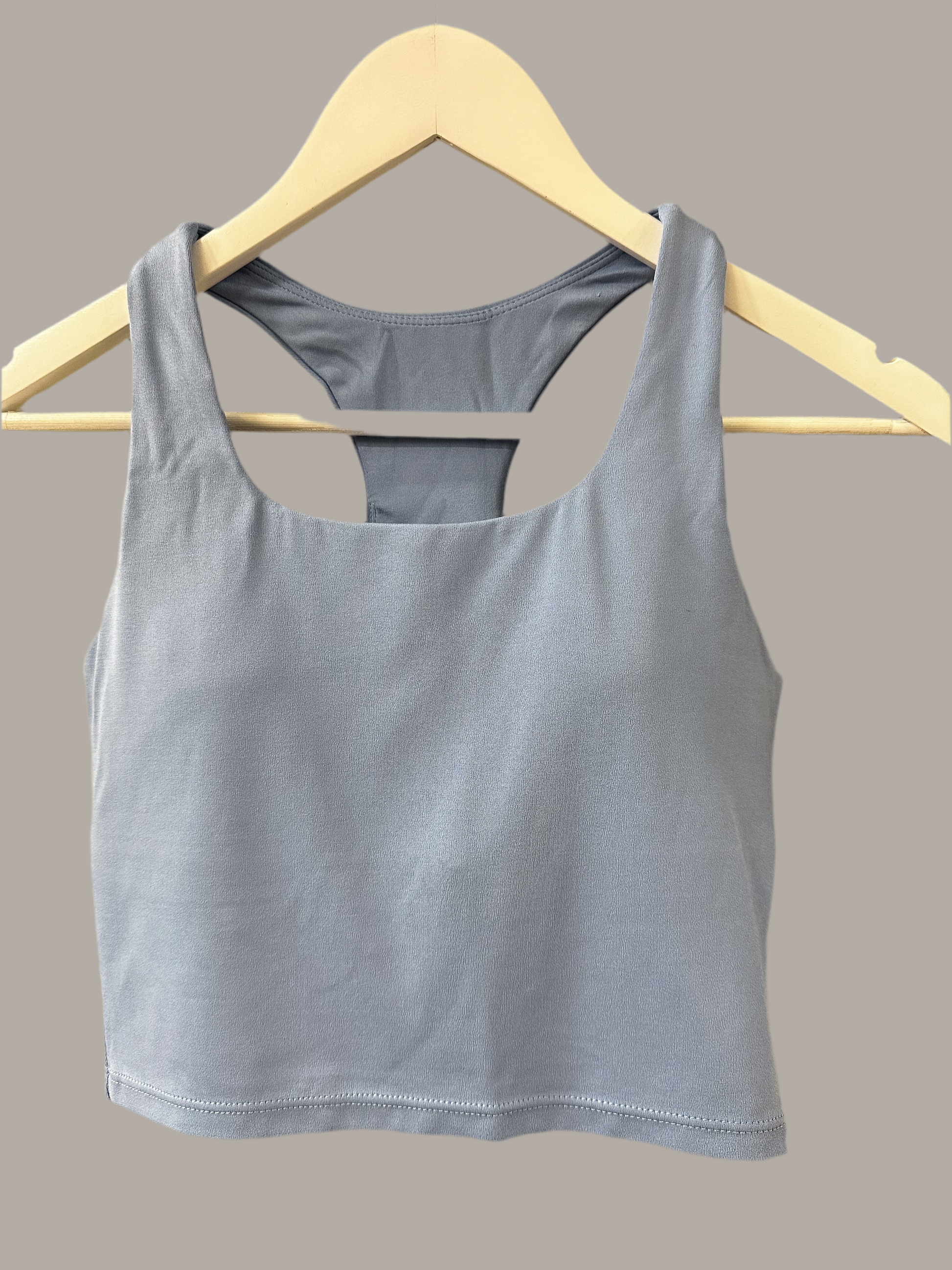 This top is made with a recylcled butter soft material. It is a long line style tank with a built in shelf bra & features a racerback.