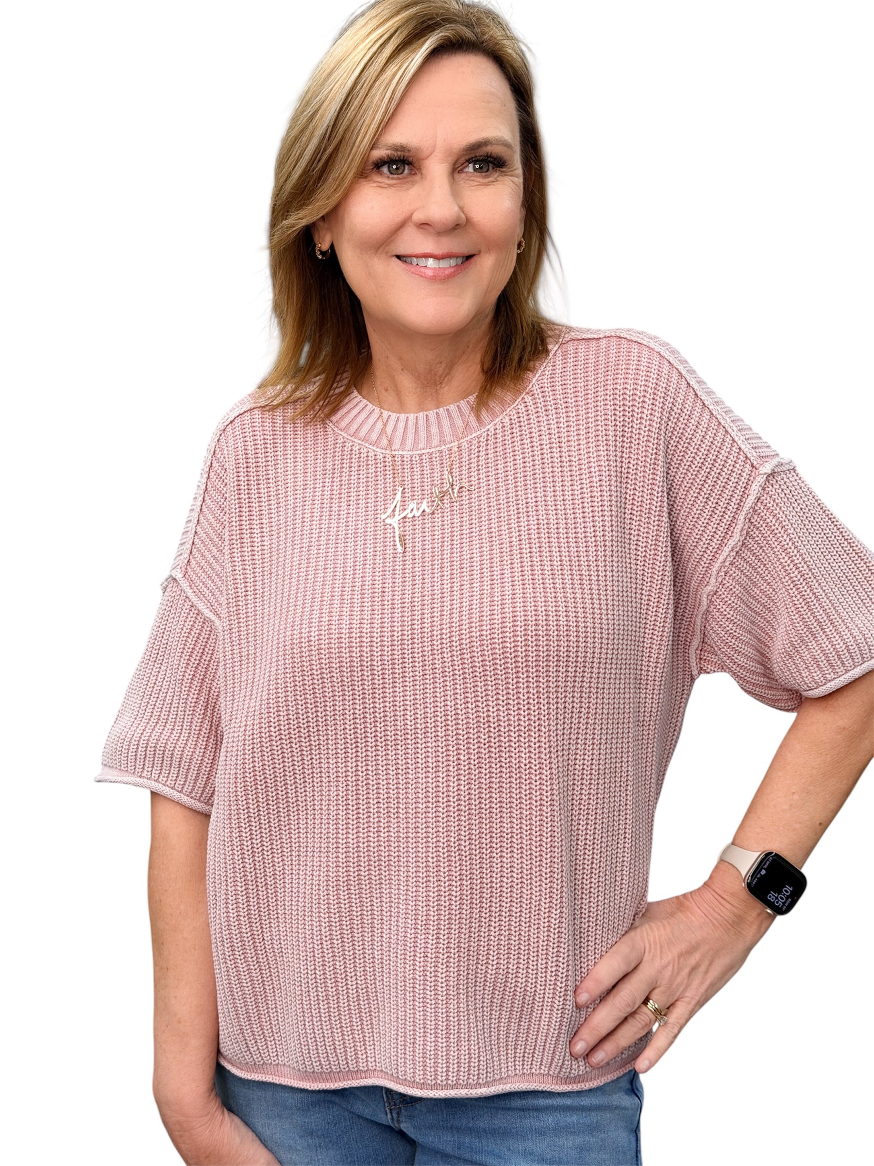The Corey Top combines contemporary design with effortless comfort. Featuring a relaxed silhouette with drop shoulders, short sleeves, and a round neckline, this knit piece offers modern appeal through intentional details—exposed seams and raw edges create visual interest while maintaining a refined aesthetic.