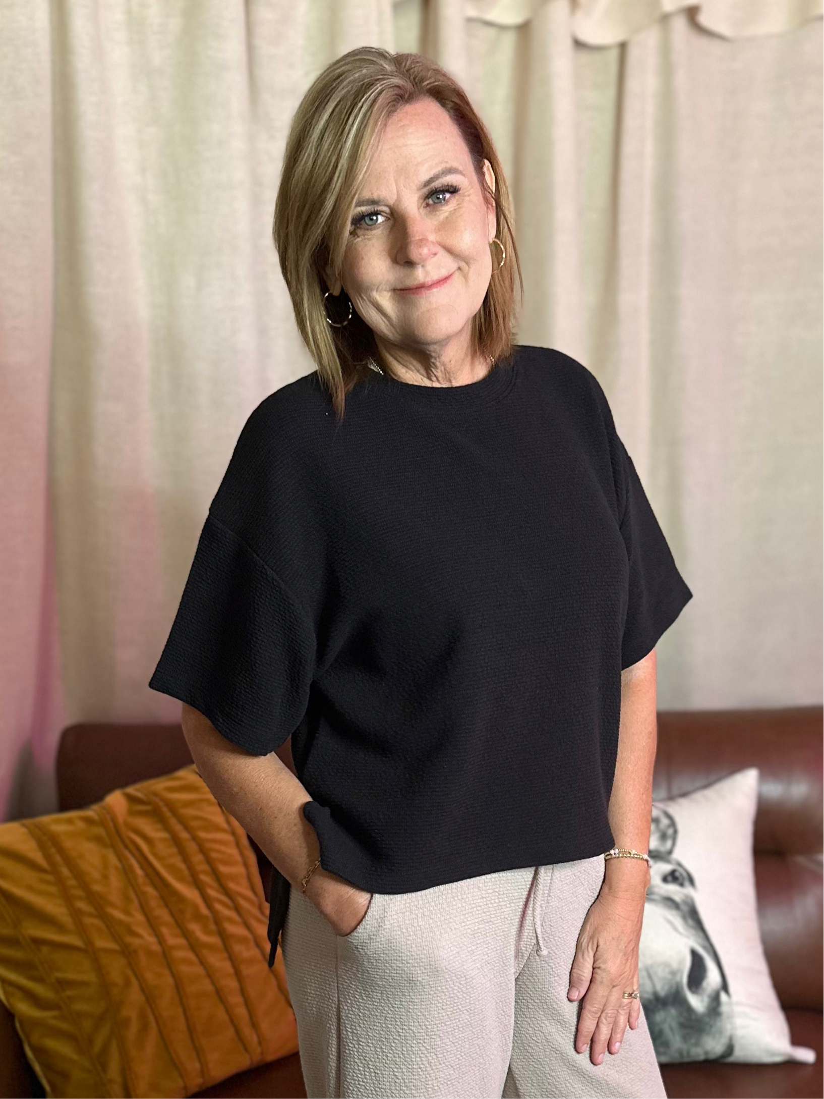 The classic Dahlia Top features a round neckline and practical 1/2 sleeves in a distinctive cloudy knit texture. Engineered for both comfort and versatility, this piece seamlessly integrates into your everyday wardrobe rotation. The premium fabric composition delivers a soft, luxurious hand-feel that maintains its comfort properties throughout extended wear periods.