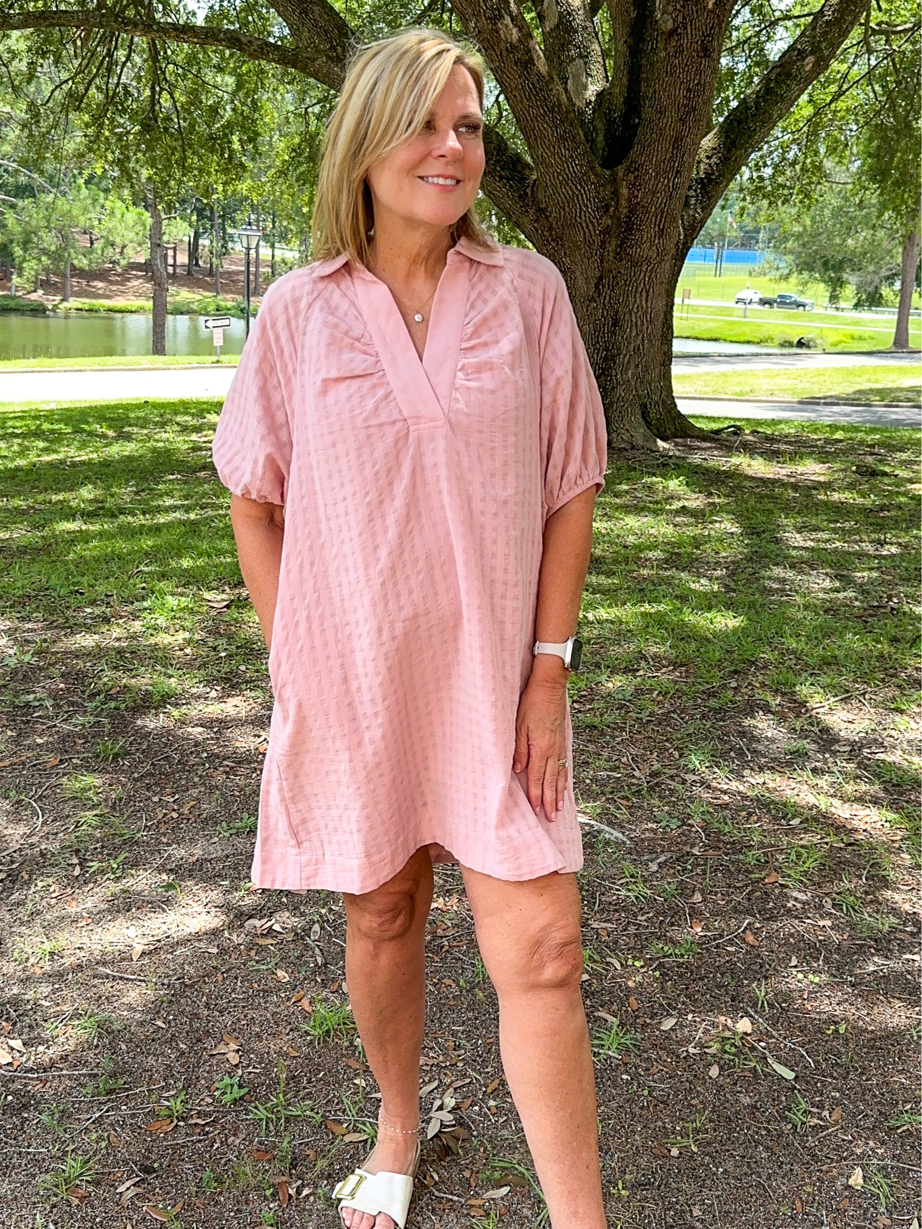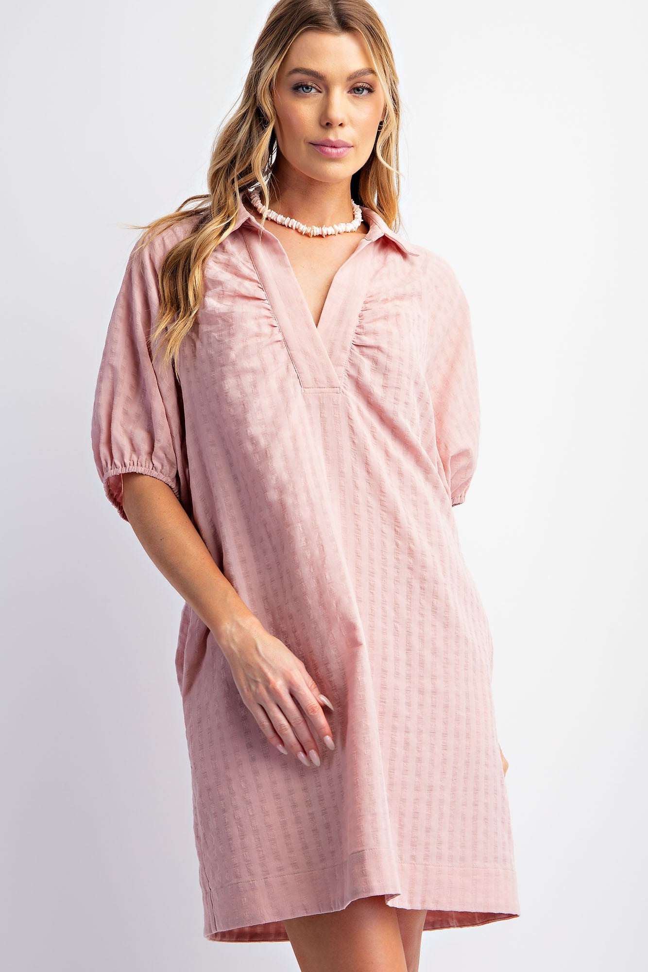 The Diana Dress features a sophisticated textured weave with a relaxed, loose silhouette that drapes elegantly on any figure. Designed with a refined collared neckline that opens to a flattering V-shape, this versatile piece combines comfort with polished style. Practical elastic cuffs provide structure while maintaining ease of movement, and convenient pockets add functional appeal to this expertly crafted wardrobe essential.
