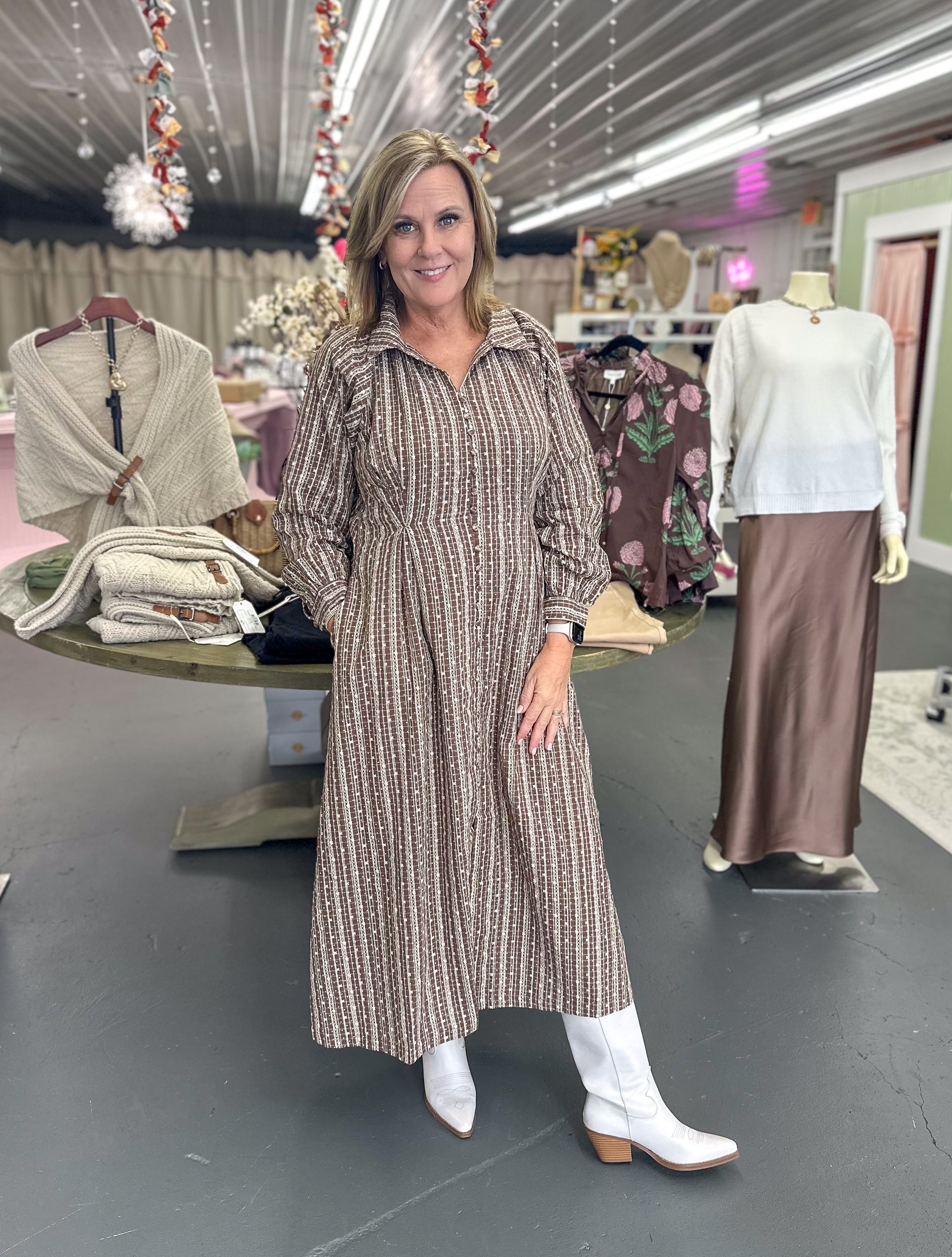 This Floral Shirt Dress combines classic check patterns with delicate floral prints for a refined yet fresh look. Featuring a pleated waist, it accentuates your silhouette while offering comfortable movement. Crafted for both style and ease, this dress is perfect for elevating everyday wear or making a subtle statement at casual events.