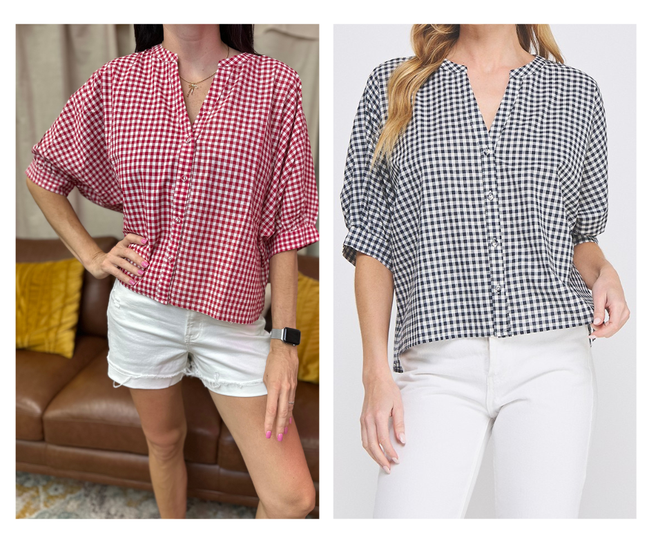 Expertly crafted from a comfortable and durable gingham cotton blend fabric, our Gingham Grace Top offers a stylish and timeless look. The button front and dolman sleeves add a touch of sophistication, making it versatile for both casual and formal occasions.