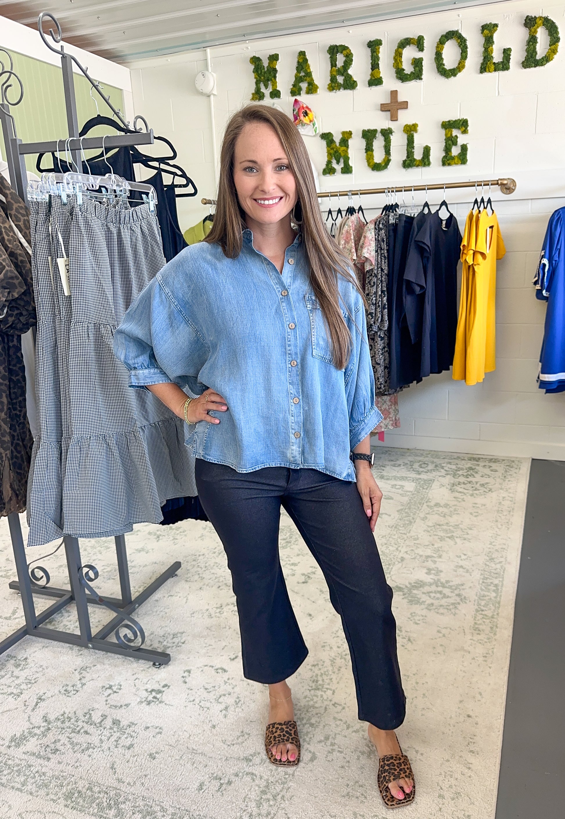 The Harper Pants combine comfort and versatility with a sleek, faux zipper fly and functional pockets for practicality. Their pull-on waistband offers a flexible, snug fit for all-day wear, while belt loops allow you to personalize your look. Featuring a straight-leg, cropped silhouette, these pants are a refined choice for effortless style and ease.