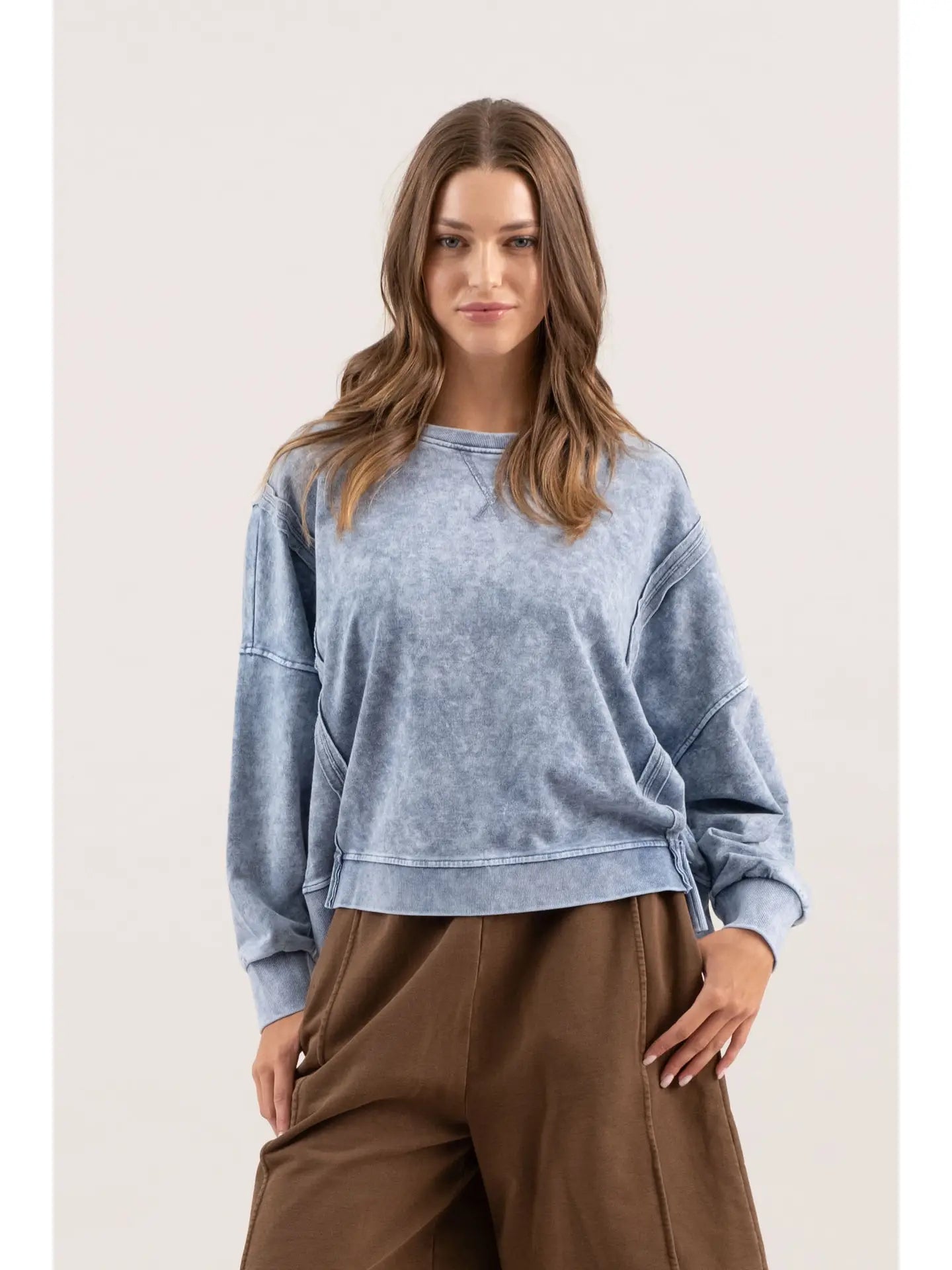 The Haven Washed Top features a refined crewneck design and extended shoulder seams for a modern silhouette. Its patchwork detail adds subtle texture and visual interest, while the long sleeves provide comfortable coverage for cooler days. Perfect for layering or wearing alone, this top combines thoughtful construction with everyday versatility.
