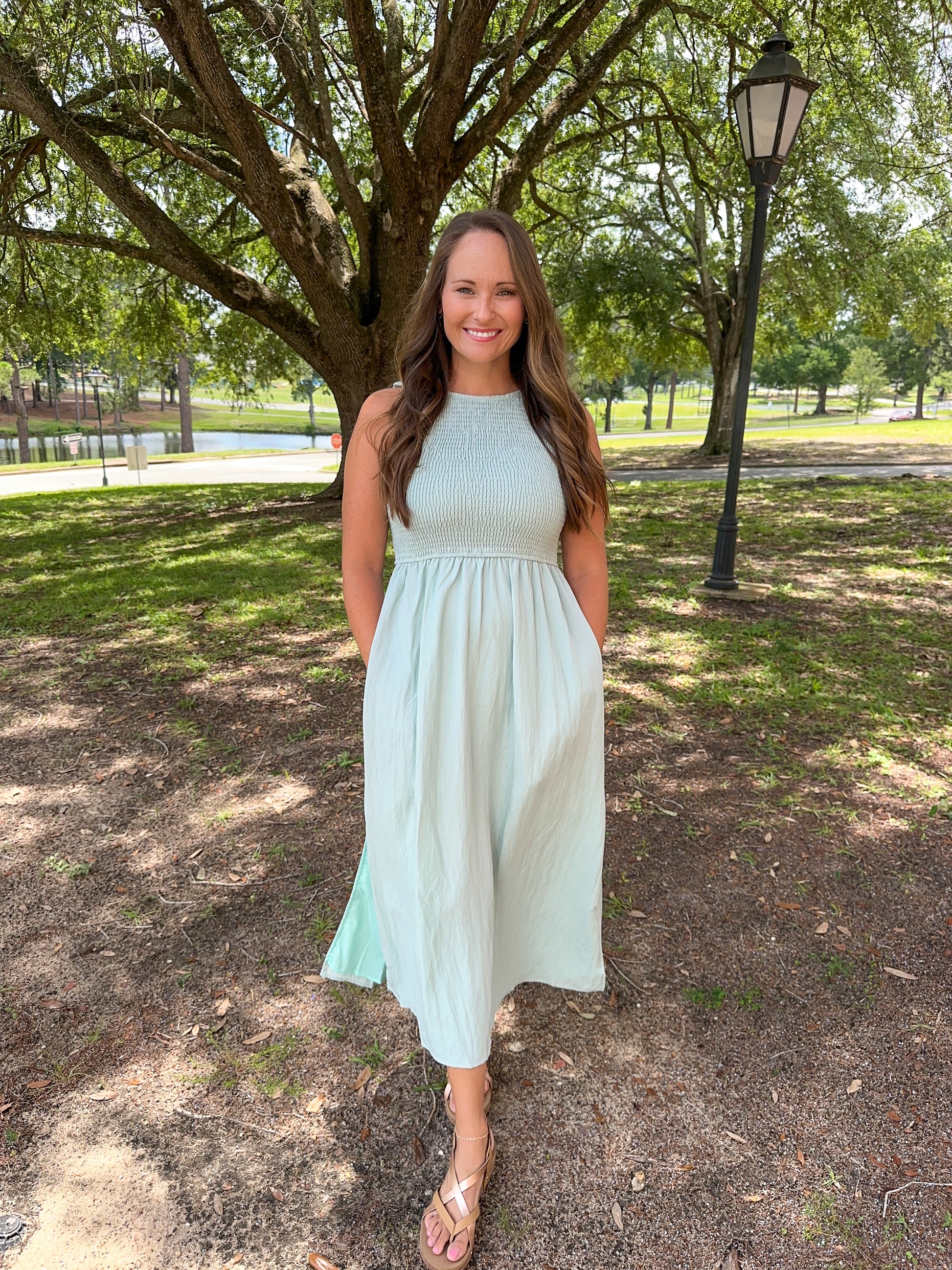 The Ingrid Dress is a sophisticated midi-length piece featuring a sleeveless smocked bodice that offers a comfortable, form-fitting silhouette. Designed with a side slit for ease of movement and a back keyhole secured by button closures, this dress balances elegance with subtle detailing, making it an ideal choice for refined, warm-weather occasions.