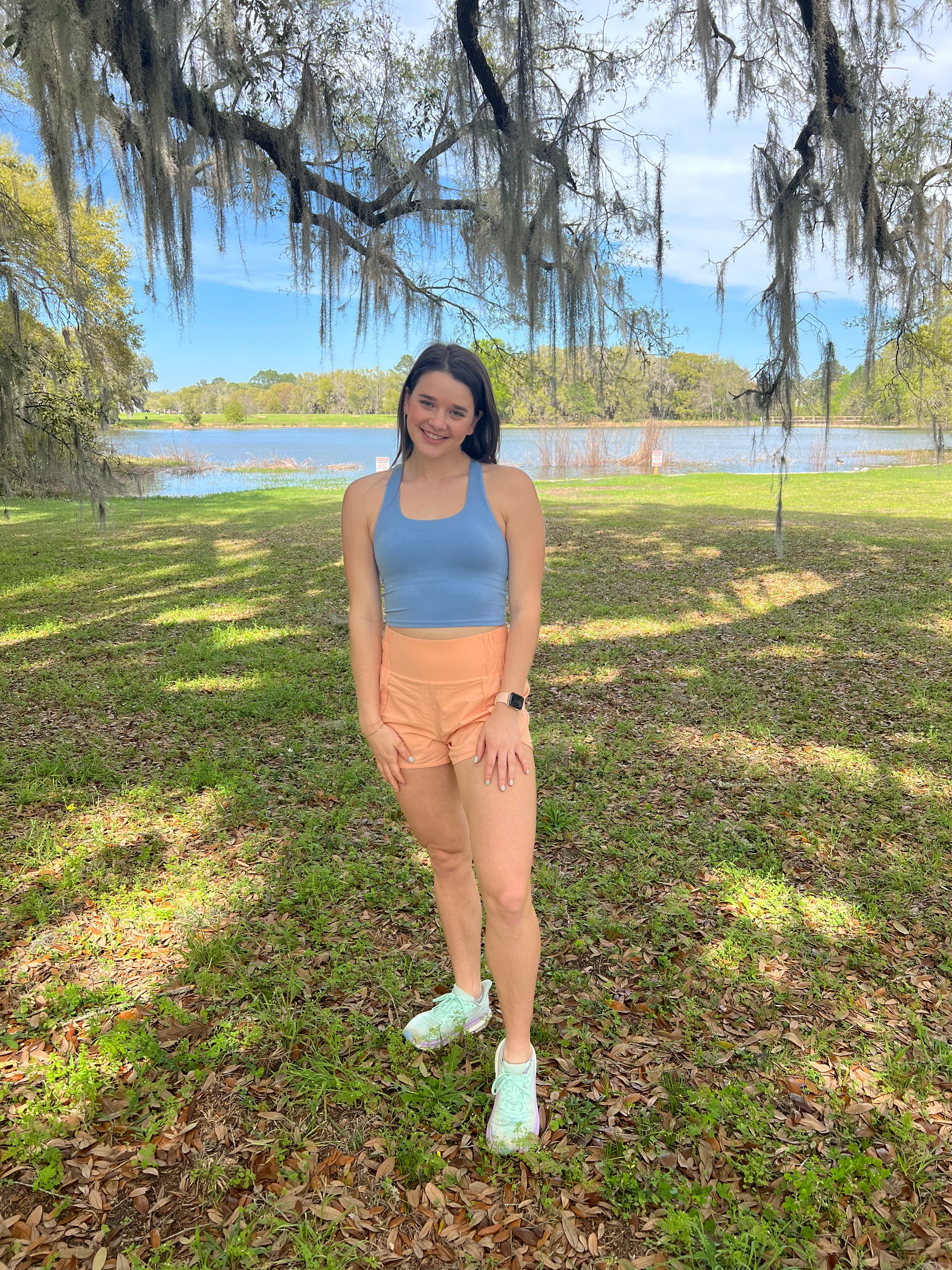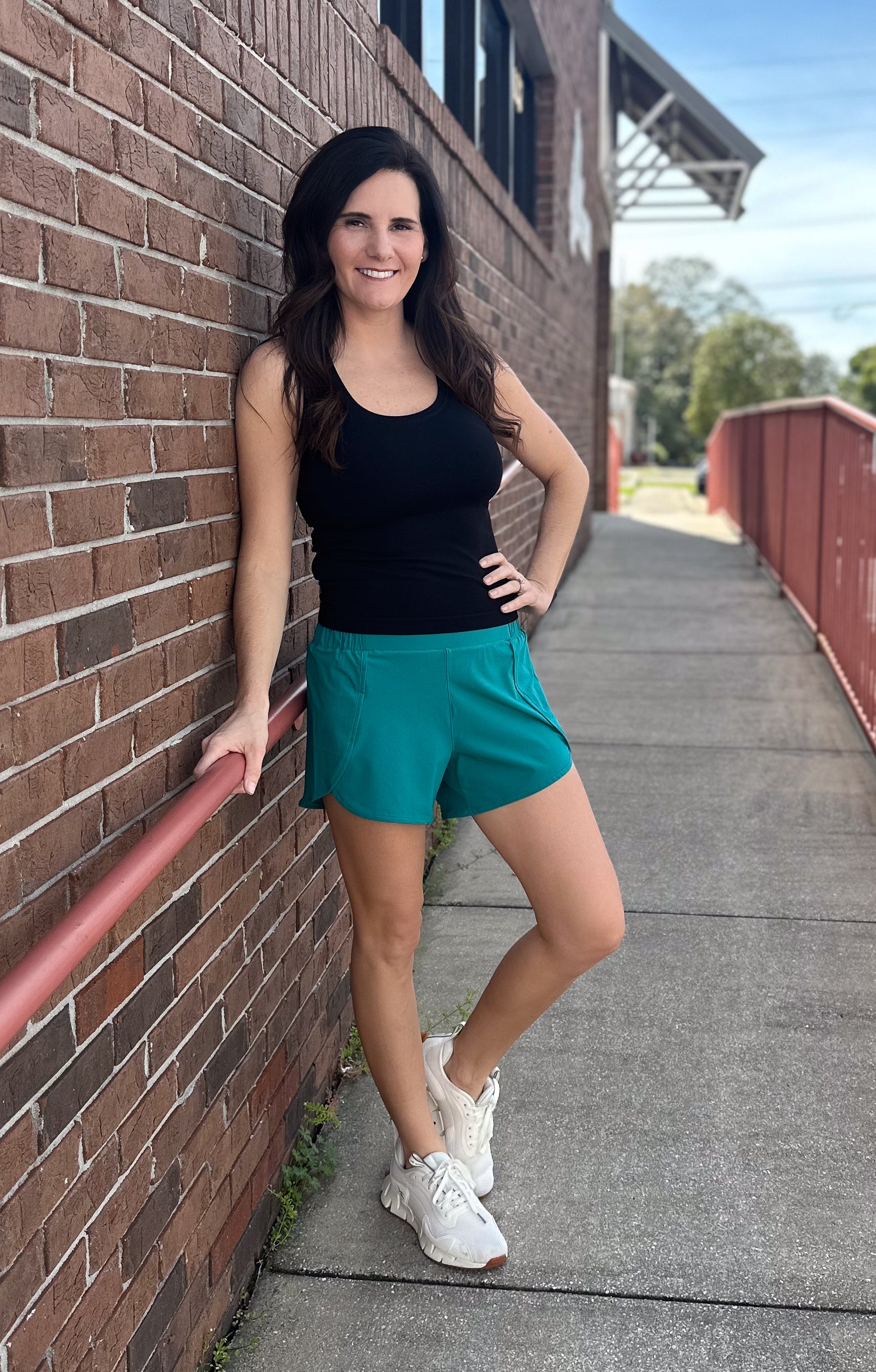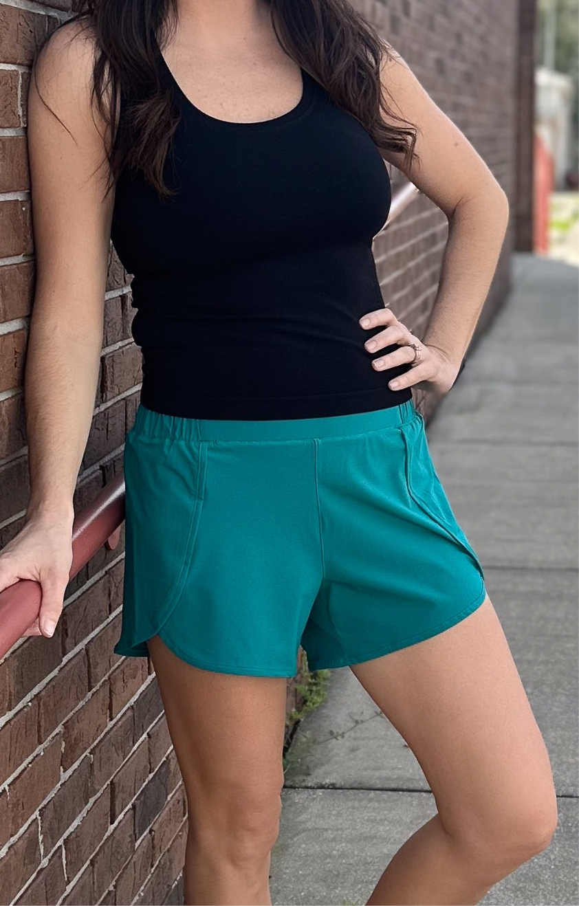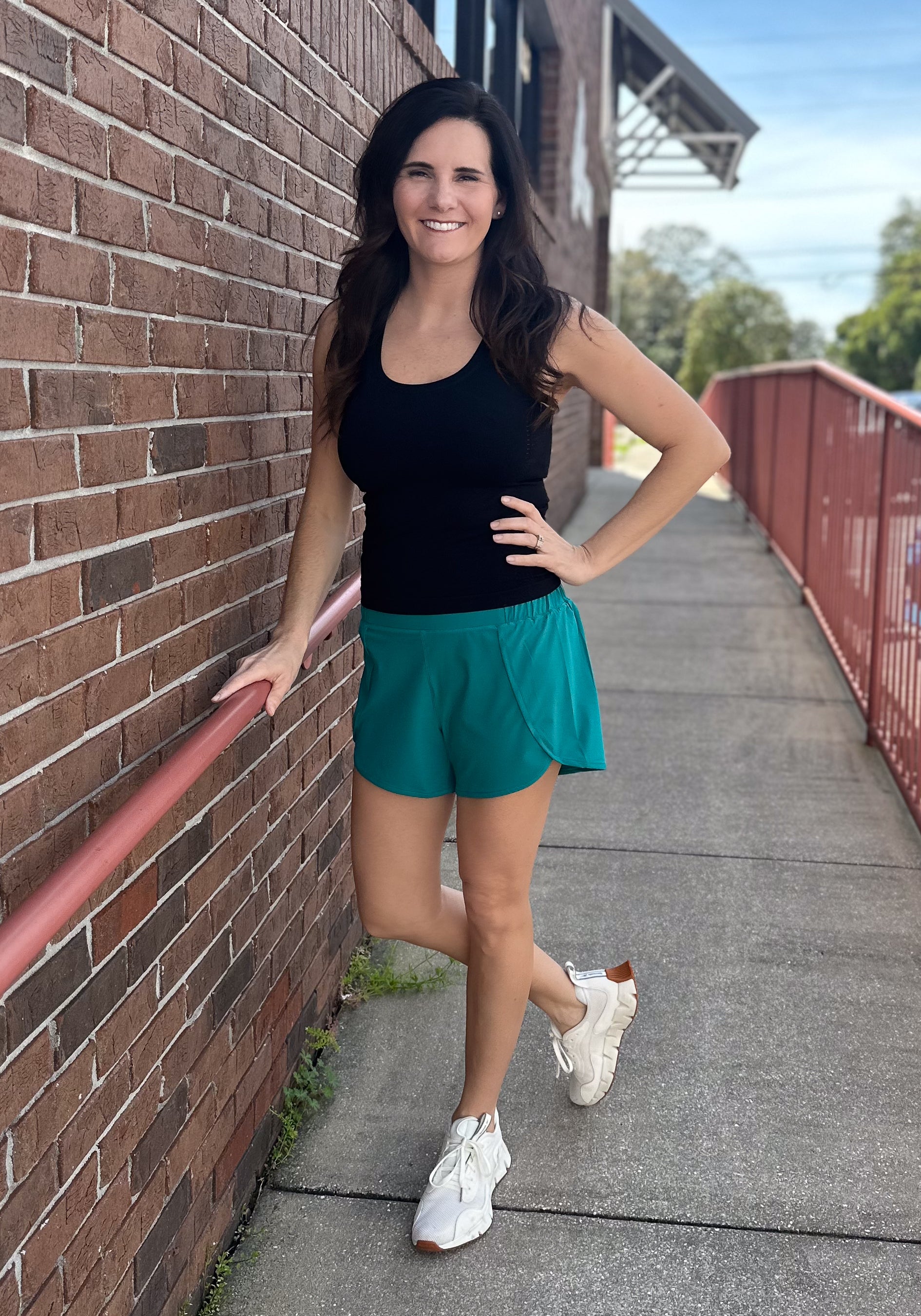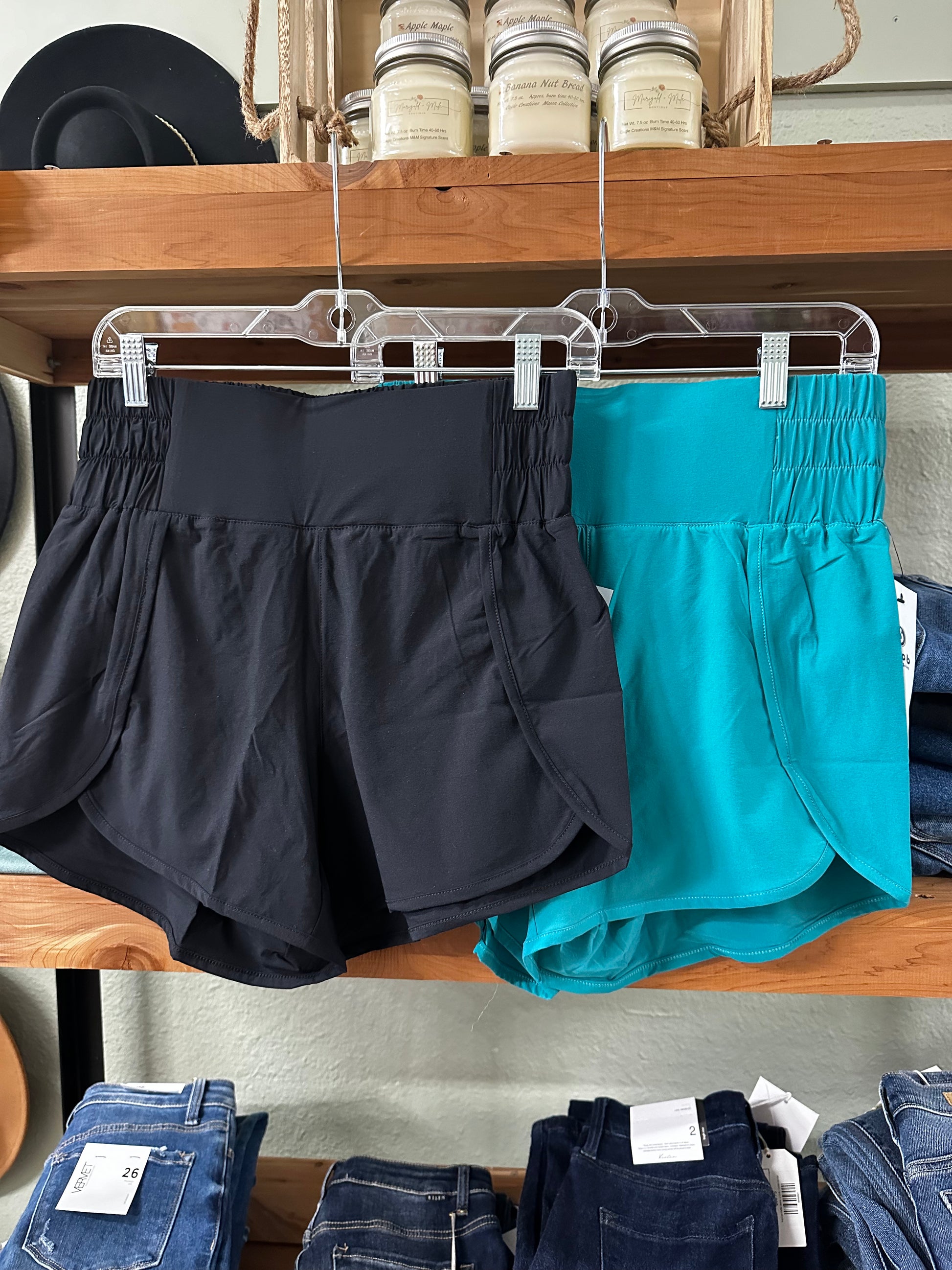 These high waisted running shorts are functional but still fashionable with the scalloped detail on the side & a partially ruched waist band detail.