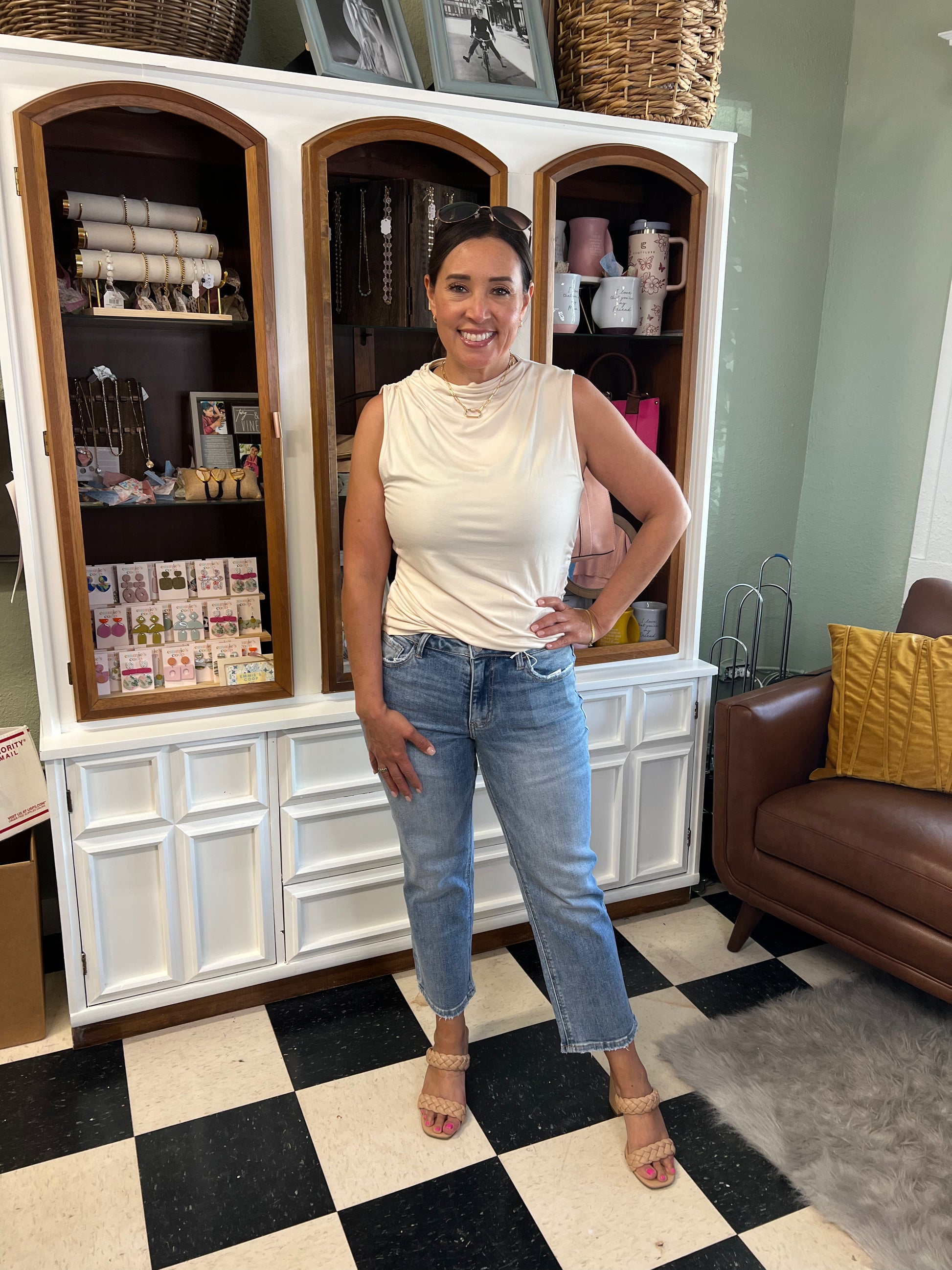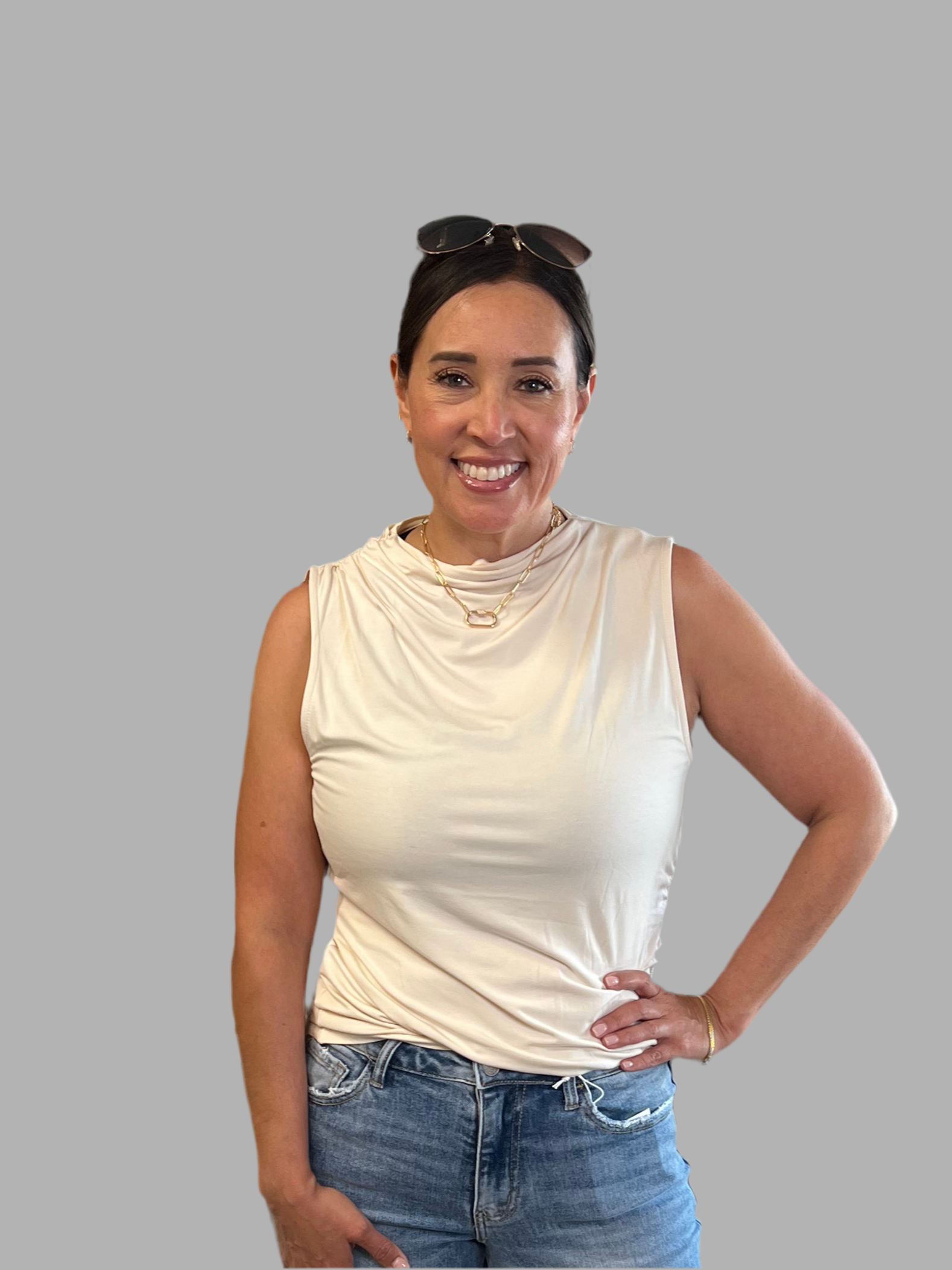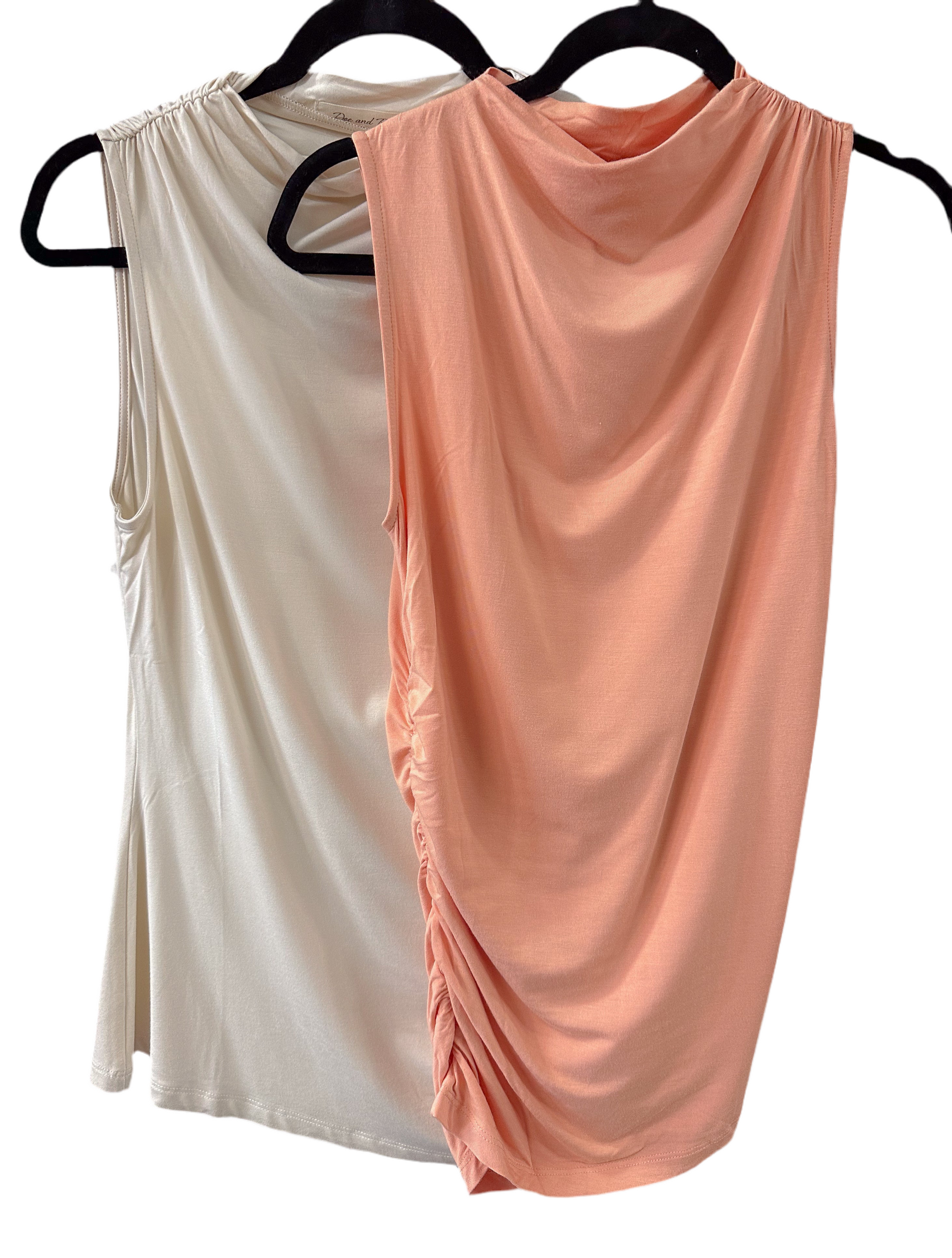 Our sleeveless mock neck top has an asymmetrical shirring on the side & is made with a soft jersey fabric.