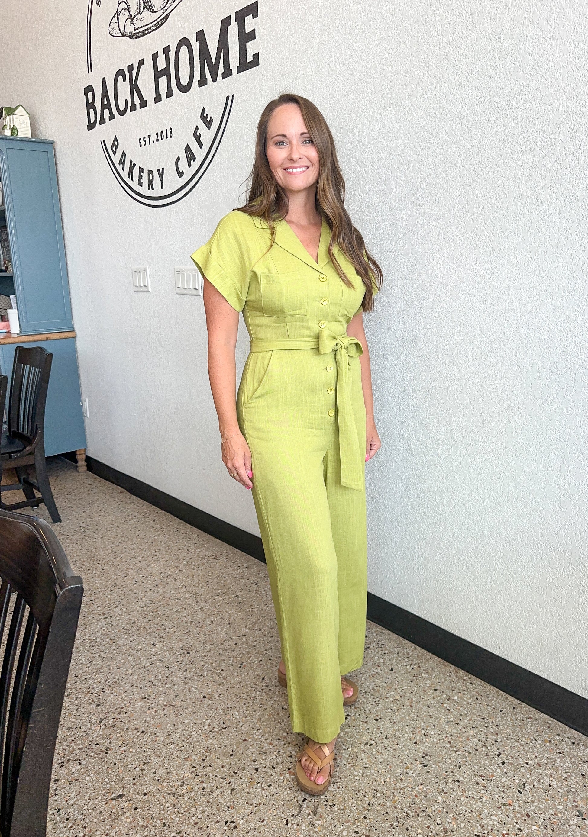 The Pistachio Jumpsuit combines sophistication with functionality through its structured lapel collar and practical button-down front. Featuring a flattering self-tie belt that defines the waist, this design is enhanced with convenient pockets for everyday essentials. The bottom portion is lined, ensuring opacity and a smooth drape against the skin. A meticulously crafted piece that balances professional polish with practical comfort.