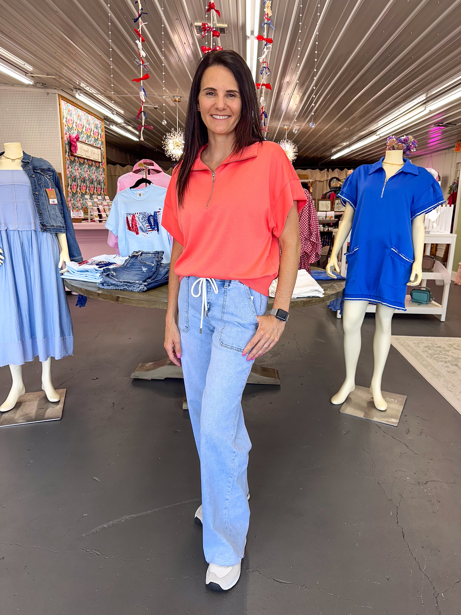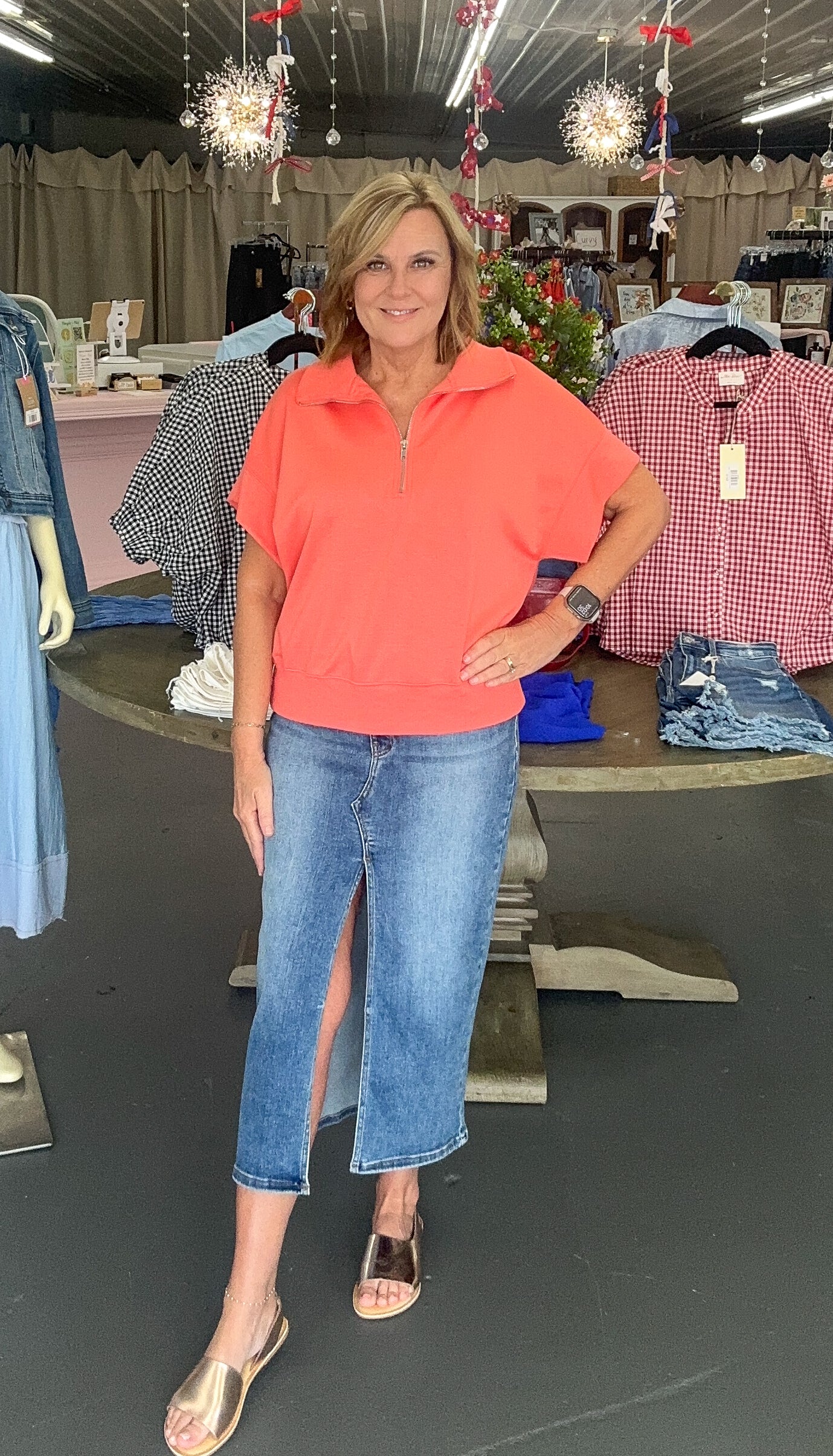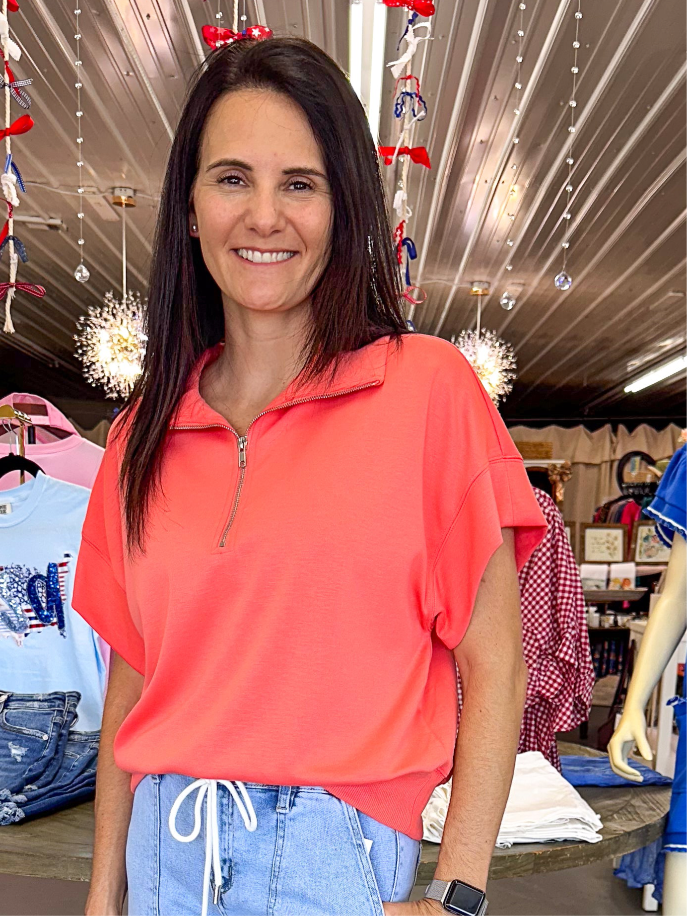 Effortlessly stylish and versatile, the Salmon Sunset Top features a half zip closure for easy wearing, a relaxed silhouette for comfort, and dolman sleeves for a modern touch. Elevate your wardrobe with this must-have piece.