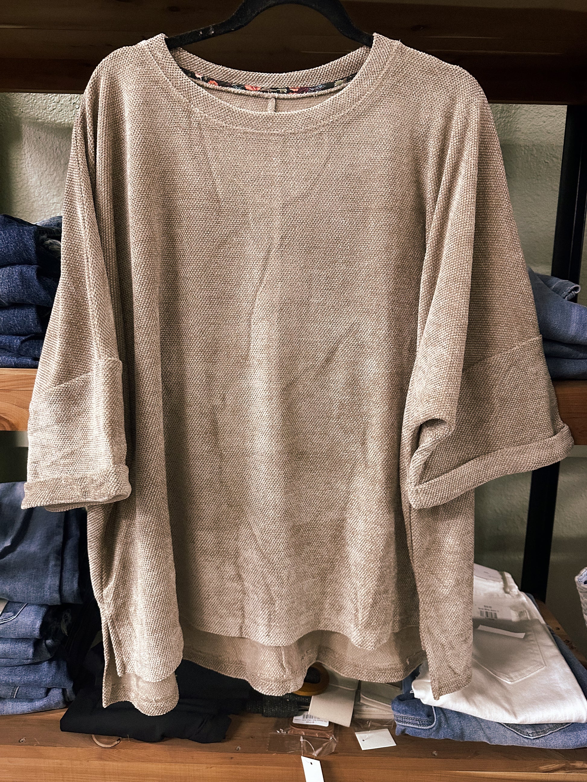 This top is great to dress up or dress down for any occasion! Fabric is a soft chenille & it is an oversized fit.