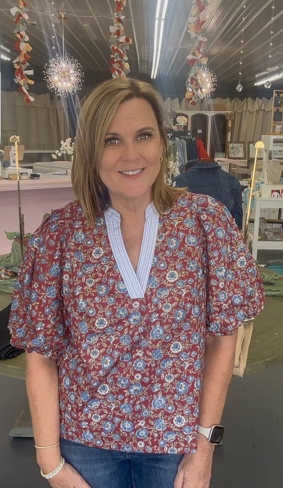 The Sapphire Rouge Top combines delicate floral prints with refined striped trim details for a sophisticated visual contrast. Designed with puff sleeves, this blouse adds volume and elegance to your silhouette while maintaining a modern, polished look. Crafted for versatility, it effortlessly transitions from professional settings to stylish casual outings, offering both comfort and distinctive style for the discerning wardrobe.
