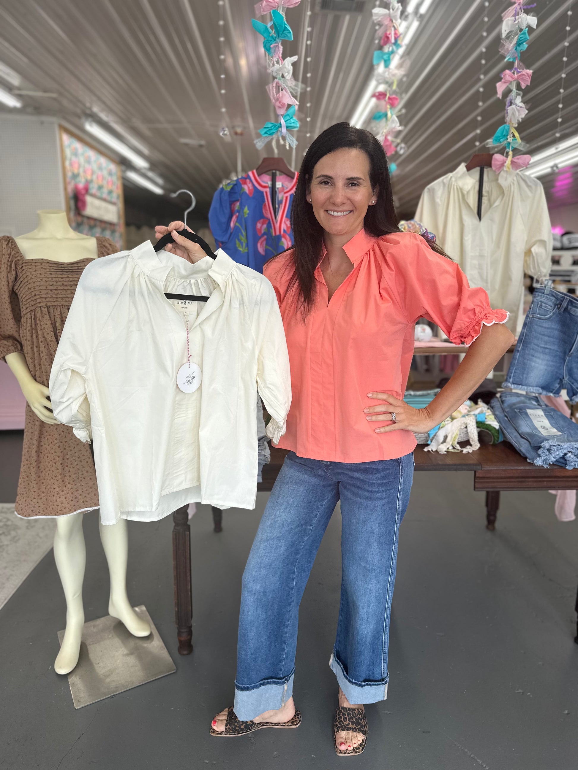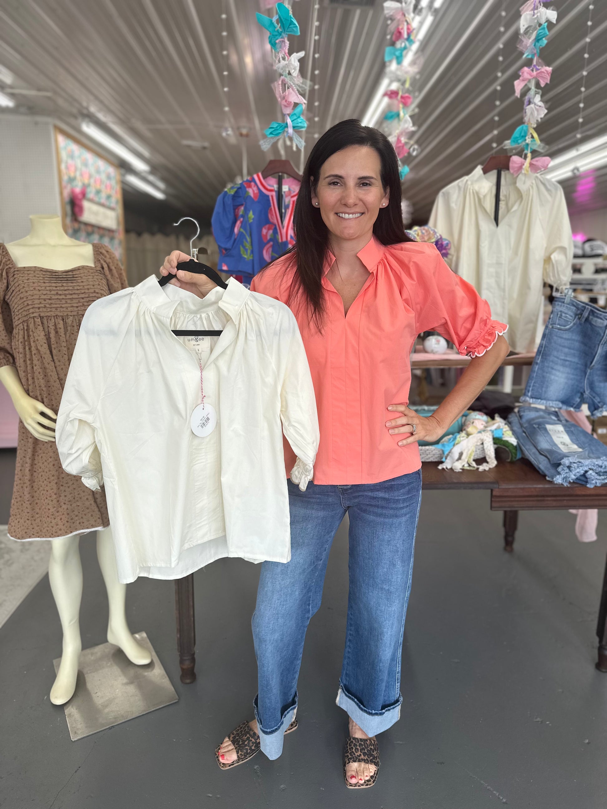 Introducing the Sher Top, featuring elegant scalloped puff sleeves for a stunning look. Elevate your style with this beautiful blouse. Made from high-quality materials, this top is both stylish and comfortable. Perfect for any occasion.