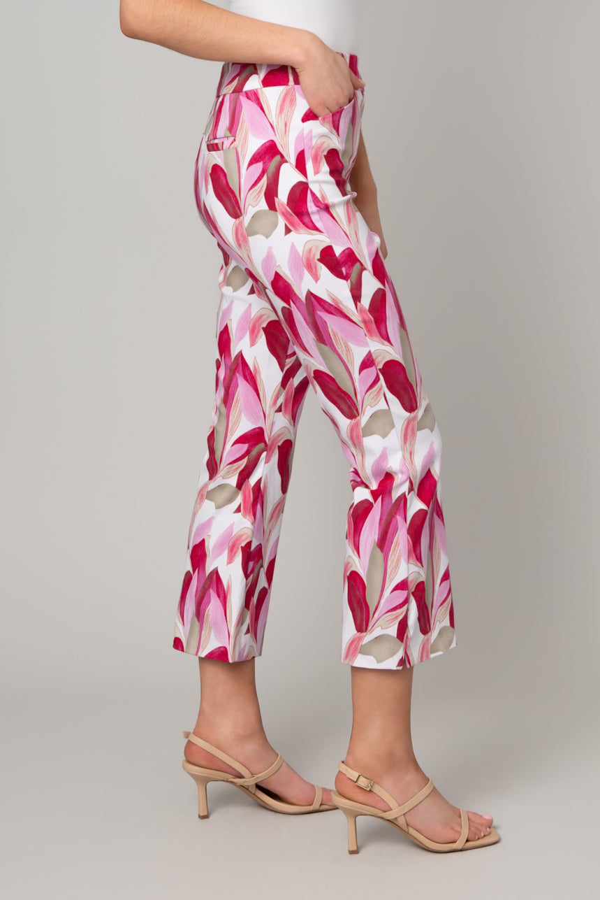 These Tropical Flare Pants combine comfort and style with a pull-on elastic waistband for an easy fit and a flattering flare silhouette. Crafted with stretch fabric, they offer freedom of movement while the cropped length and hem vents add a modern touch. Functional front pockets provide practicality, and the vibrant tropical print brings a fresh, lively vibe to your wardrobe. Ideal for warm weather, these pants balance relaxed comfort with chic design.