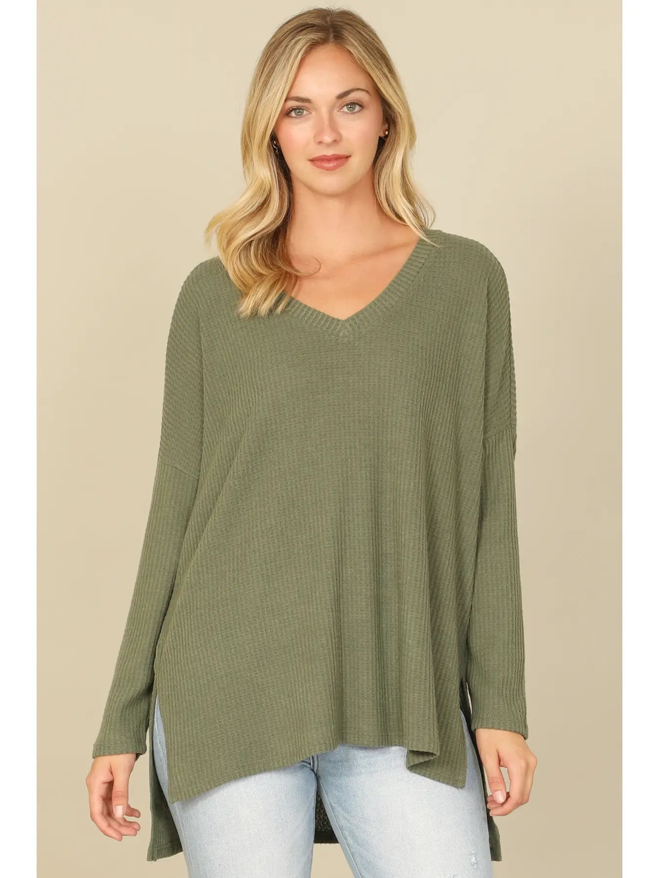 Crafted from brushed waffle fabric, this long sleeve top delivers exceptional softness with a graceful drape that moves beautifully with you. The flattering V-neckline creates an elegant silhouette while the textured weave adds visual interest and dimension. Perfect for layering or wearing solo, this versatile piece transitions seamlessly from casual to polished occasions. A wardrobe essential that combines comfort with understated sophistication.